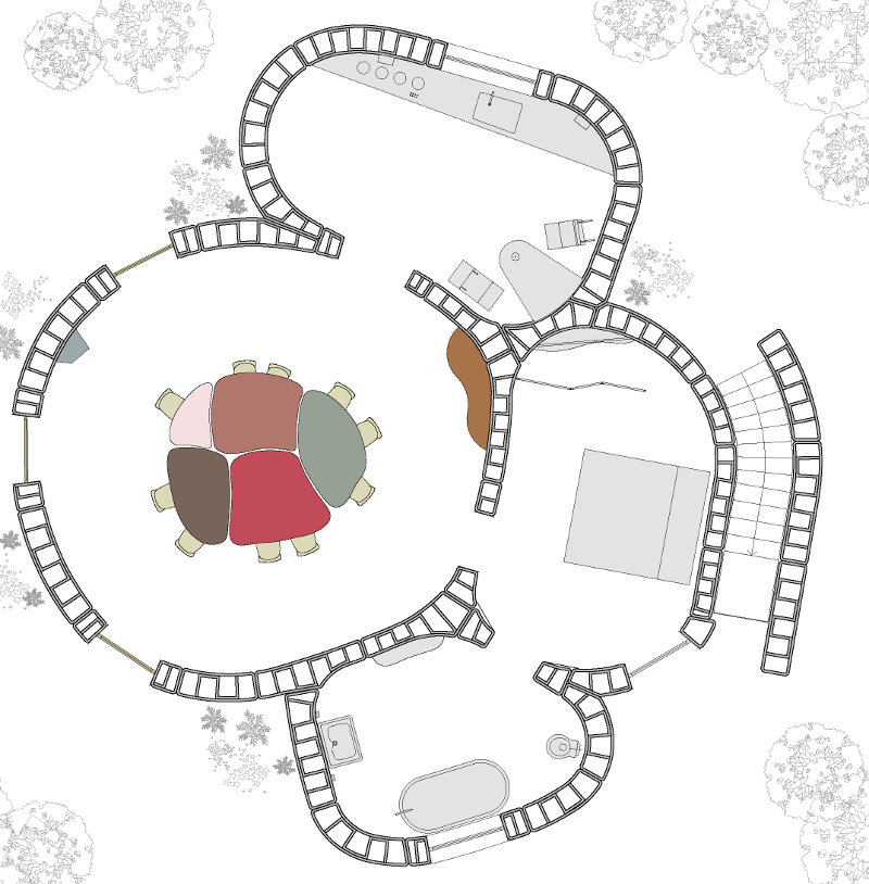 interiors have been designed with reference to archetypes of the past, in a dialogue with the 3d language.