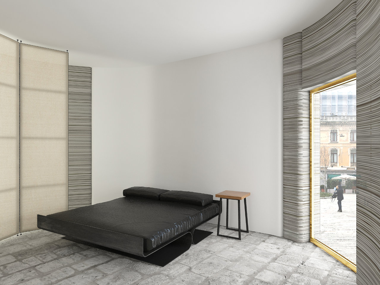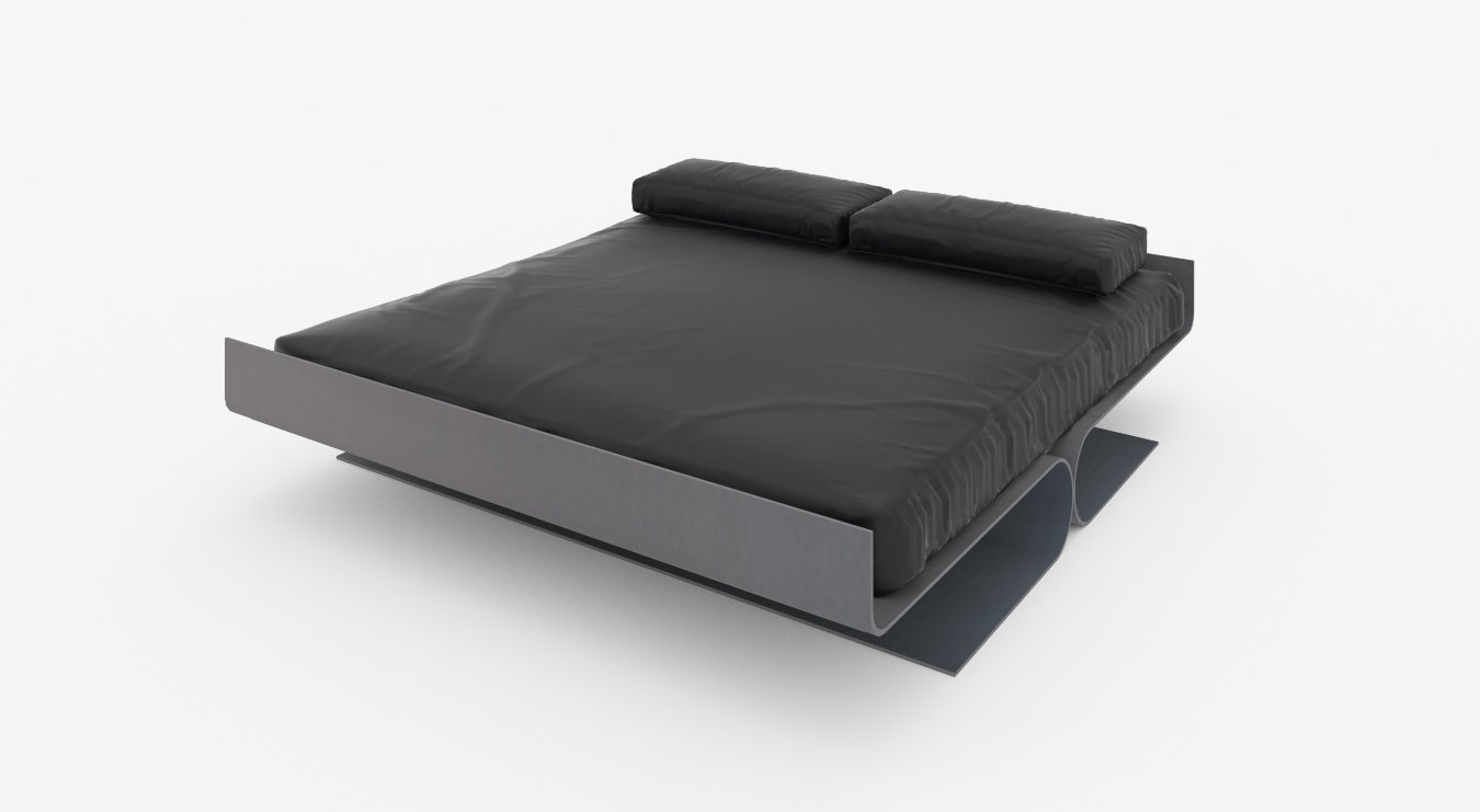 Black iron bed made out of two iron sheets, bended in order to create the feeling of a swinging craddle.